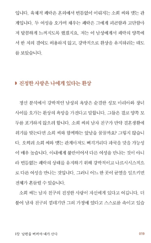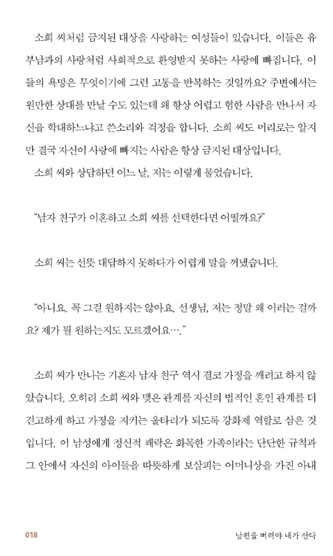 이 책은 결혼 생활에서 오는 다양한 고민들을 현실적으로 그려내며, 자신을 돌보지 않고 타인의 기대와 역할에 묶여 살아가는 여성들의 삶을 진지하게 탐구합니다. 작가는 남편과의 관계에서 발생하는 감정적 부담, 가족을 위한 헌신과 개인적인 희생 사이에서 갈등하는 모습을 솔직하게 그려냅니다. 그런 상황 속에서 여성들은 자신을 잃고, 삶의 균형을 잃은 채 살아가고 있음을 말하고 있습니다.